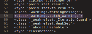 Moving to __base__.__subclasses__() I found the <class 'warnings.catch_warnings'>
